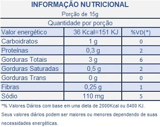Ingredientes: Água, castanha de caju, óleo de coco palmiste, amido, suco de limão, sal marinho goma xantana e conservante sorbato de potássio.